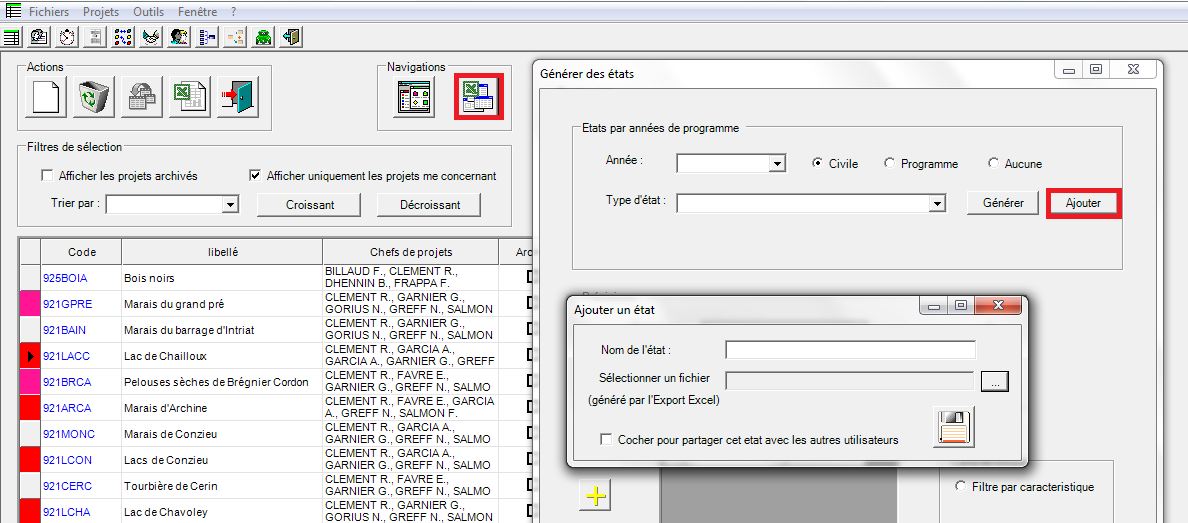 Les états créés à partir de l’Export Excel sont accessibles depuis toutes les fenêtres de génération d’états de Logeproj. Il existe donc plusieurs possibilités pour les générer.