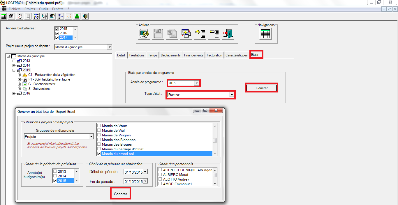 . La fenêtre générer un état issu de l'export Excel s'ouvre, permettant d'affiner les filtres à appliquer sur l'état (choix de métaprojets, choix d'un d'un ou de plusieurs projets, choix d'une période de prévision et/ou de réalisation, choix d'un ou de plusieurs personnels). Si une année (civile ou de programme) avait été sélectionnée dans la fenêtre générer un état, celle-ci est pré-sélectionnée par défaut comme année budgétaire dans la fenêtre générer un état issu de l'export Excel. Ce choix peut être modifié: les filtres appliqués dans la fenêtre générer un état issu de l'export Excel sont toujours prioritaires sur ceux sélectionnés dans la fenêtre générer un état - Cliquer sur le bouton